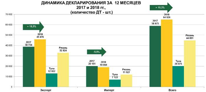 В Тульской таможне подведены итоги работы в 2018 году. Статистика внешнеэкономической деятельности свидетельствует об увеличении объемов внешнеторгового оборота, росте экономики и уровня инвестиционной активности, а также промышленного производства в регионе деятельности Тульской таможни – Тульской и Рязанской областях.