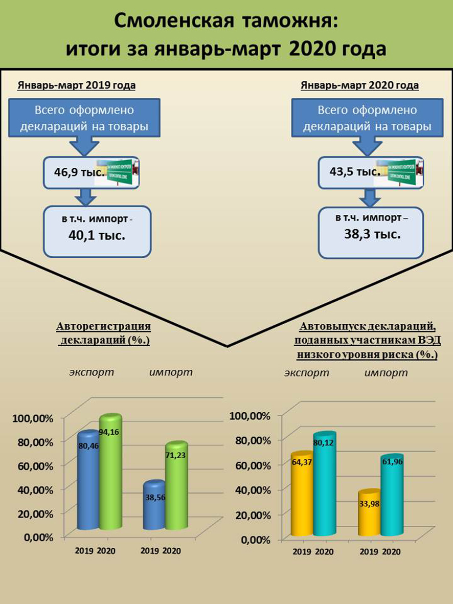 В условиях борьбы с распространением коронавирусной инфекции Смоленская таможня обеспечивает бесперебойное оформление перемещаемых через границу товаров в период объявленной нерабочей недели на всех таможенных постах.