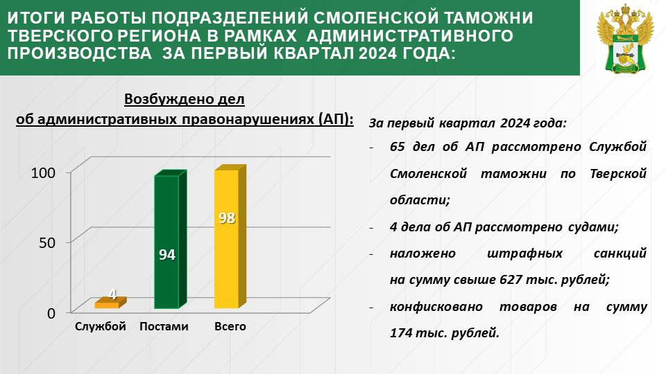 Материалы по фактам выявленных нарушений действующего законодательства в 1 квартале 2024 года направлены в правоохранительные органы для принятия процессуальных решений, таможенными органами и полицией уже возбуждено 4 дела об АП и 2 уголовных дела по ст. 226.1 УК РФ.