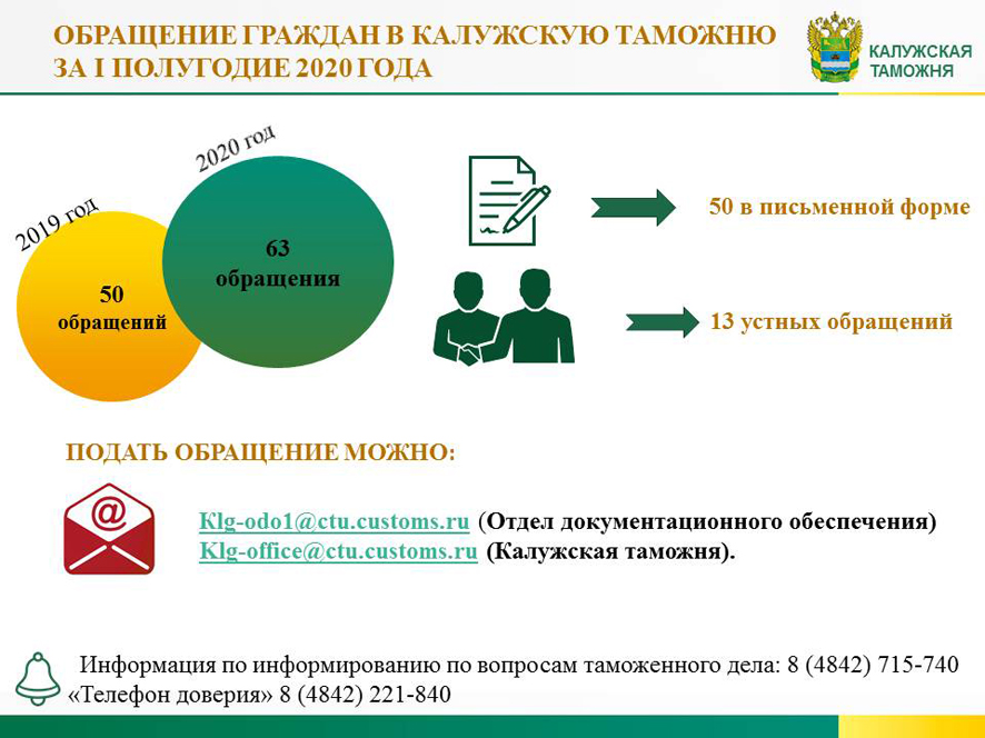 В первом полугодии 2020 года в Калужскую таможню поступило 63 обращения граждан, что на 26 % больше, чем за 2019 год. Четыре из них от иностранных граждан поступило 4 обращения, они касались вопросов таможенной инфраструктуры и пересылки товаров в международных почтовых отправлениях, а также продления срока временного ввоза транспортного средства физическим лицом.