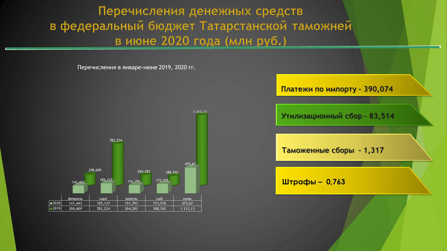 За январь – июнь 2020 года сумма поступивших в федеральный бюджет России таможенных платежей составила 5 миллиардов 189 миллионов 790 тысяч рублей.