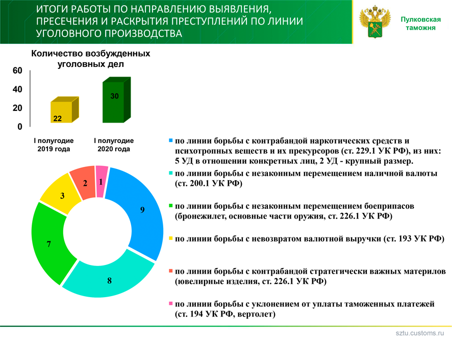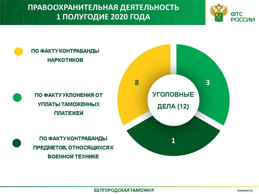 Омской таможней за 6 месяцев 2020 года при выявлении и пресечении нарушений таможенного законодательства Евразийского экономического союза и Российской Федерации возбуждено 11 уголовных дел в отношении конкретных лиц, из них 6 уголовных дел возбуждено по фактам контрабанды сильнодействующих веществ по ч. 1 ст. 226.1 УК РФ, при этом оперативными подразделениями таможни из незаконного оборота изъято почти 800 гр. сильнодействующих веществ.