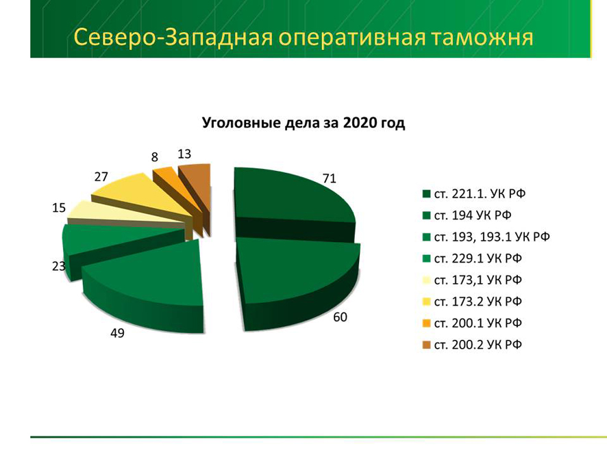 71 уголовное дело возбуждено по статье 226.1 УК РФ – контрабанда сильнодействующих и ядовитых веществ, стратегически важных товаров и ресурсов.