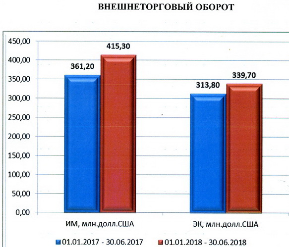 В 1 полугодии 2018 года значительно увеличились стоимостные и весовые показатели торговли со странами - членами Евразийского экономического союза. Стоимостные показатели возросли на 45% и составили более 3,5 млн.долларов США, натуральные – на 72% и составили 21,6 тыс. тонн.