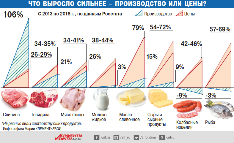 «Опросы, которые мы проводили, показывают, что большинство людей в России продовольственные контрсанкции поддерживают. Но одновременно много жалоб на дороговизну. После введения эмбарго доля расходов на продовольствие в бюджете средней российской семьи выросла с 28 до 33%», — свидетельствует главный научный сотрудник Центра агропродовольственной политики РАНХиГС Василий Узун. Росстат тоже подтверждает: за минувшие 5 лет розничные цены почти на все контрсанкционные продукты выросли сильнее, чем за такое же время с 2008 по 2013 г. Замедлился рост только на говядину и колбасные изделия. А цены на свинину побежали вперёд в 2 раза быстрее, даже несмотря на то, что производство этого мяса выросло за пятилетку тоже в 2 раза (см. инфографику). Когда такое бывало! Почему так происходит?