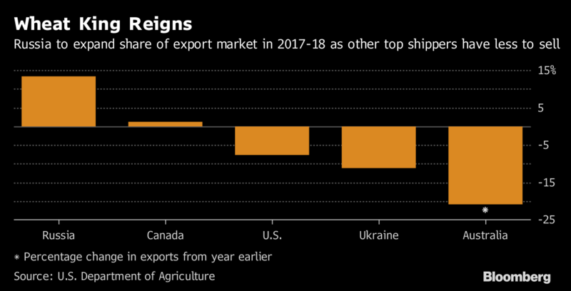 Поставки пшеницы из России, как ожидается, будут превышать экспорт любой другой страны. Часть их окажется в Азии, где за последние десять лет импорт почти удвоился, поскольку рост доходов увеличил спрос на лапшу, торты и хлеб. В этом сезоне австралийское производство переживает самый значительный спад за последнее десятилетие, у американских фермеров самый маленький урожай с 2002 года, а урожай Канады сократился в третий раз за четыре года.