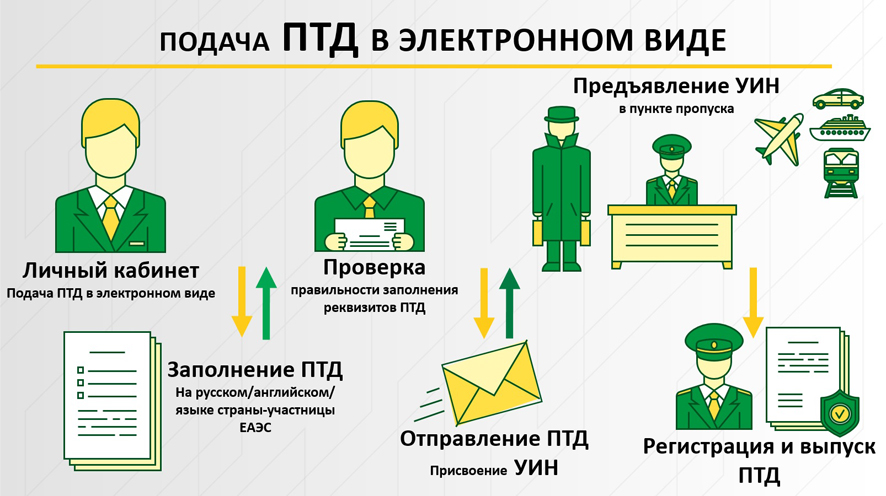 Таким образом, сервис «Личный кабинет участника ВЭД» обеспечивает подачу ПТД в электронном виде «до» или «при» пресечении таможенной границы ЕАЭС через персонифицированное информационное взаимодействие между физическим лицом и таможенными органами. Для этого не требуется обращения к таможенному представителю и приобретение специализированных программных средств. Заполнить ПТД можно заблаговременно, что позволяет не тратить время на заполнение бумажного бланка ПТД непосредственно на границе и существенно экономит время при её пересечении.